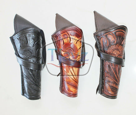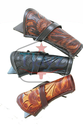 This Unique Tooled Western Right Draw, Cross Draw easily slides over any belt up to three inches thick. Our cross draws are designed to fit forĀ most but not all 22Ā caliber revolvers. Comes in your choice of black, brown andĀ harvest.