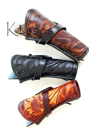 Our unique handmade Cross Draw Holsters have been given individualized attention by a skilled leather artisan for a one-of-a-kind appearance and fit. Each beautifully tooled leather holster is created just for our shop. By combining tradition and skill, each piece speaks of its unique authenticity. Easily slides onto your belt (up to 3 inches thick). Don't have a belt, we got that too. Check out our store for more amazing products.