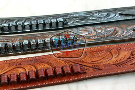 This Unique Tooled Western Gun Belt comes with one right draw, droop loop holster, sized for Most but not all 357/38 caliber revolver and fits most barrel lengths 4 to 6 inches. Rig measures 3 inches wide with a heavy gauge silver tone belt buckle. Available waist sizes, 34" to 52" and comes in your choice of black, brown and harvest