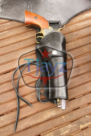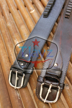This Unique Tooled Western Gun Belt comes with one smooth, right draw holster, sized for Most but not all 22 caliber revolver and fits most barrel lengths 4 to 6 inches. Rig measures 3 inches wide with a heavy gauge silver tone belt buckle. Available waist sizes, 34" to 52" and comes in your choice of black and Chocolate brown.