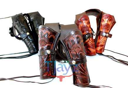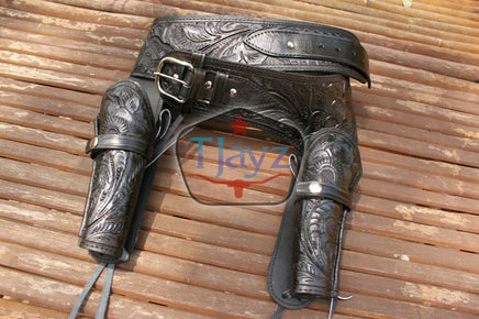 This Unique Hand Tooled Western Gun Belt comes with two droop loop holsters, sized for Most but not all 44/45 caliber revolver and fits most barrel lengths 4 to 6 inches. Rig measures 3 inches wide with a heavy gauge silver tone belt buckle. Available waist sizes, 34" to 52" and comes in your choice of black, brown and harvest