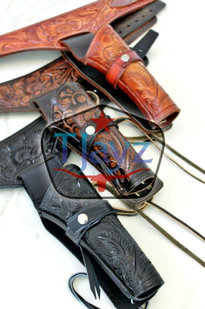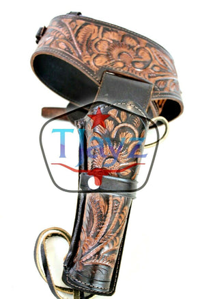 This Unique Tooled Western Gun Belt comes with one left draw holster, sized for Most but not all 22 caliber revolver and fits most barrel lengths 4 to 6 inches. Rig measures 3 inches wide with a heavy gauge silver tone belt buckle. Available waist sizes, 34" to 52" and comes in your choice of black, brown and harvest
