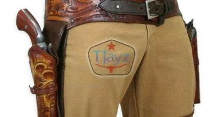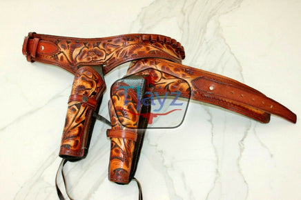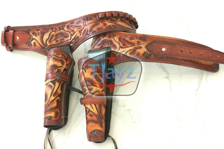This Unique Tooled Western Gun Belt comes with two droop loop holsters, sized for Most but not all 44/45 caliber revolver and fits most barrel lengths 4 to 6 inches. Rig measures 3 inches wide with a heavy gauge silver tone belt buckle. Available waist sizes, 34" to 52" and comes in your choice of black, brown and harvest